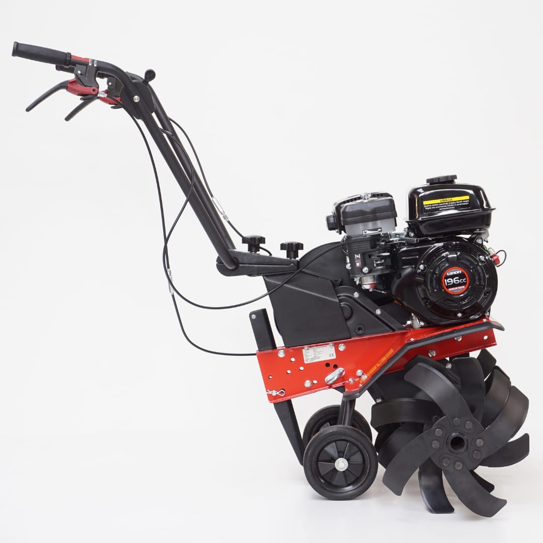 Uchwyt prowadzący można wyregulować w zależności od potrzeb, w dwóch płaszczyznach, co pozwala nawet na całkowite obrócenie go na bok i zniwelowanie problemu zadeptywania. Glebogryzarka spalinowa Hortmasz HGS 155 L ma możliwość pracy na biegu wstecznym, co znacznie ułatwia proces wydobycia maszyny z ziemi w przypadku utknięcia. Glebogryzarkę ogrodową Hortmasz HGS 155 L można wyposażyć w szereg akcesoriów takich wyorywacz, pług, obsypnik czy duże gumowe koła, które sprawią, że maszyna stanie się niezastąpiona w ogrodzie. (akcesoria dodatkowe)