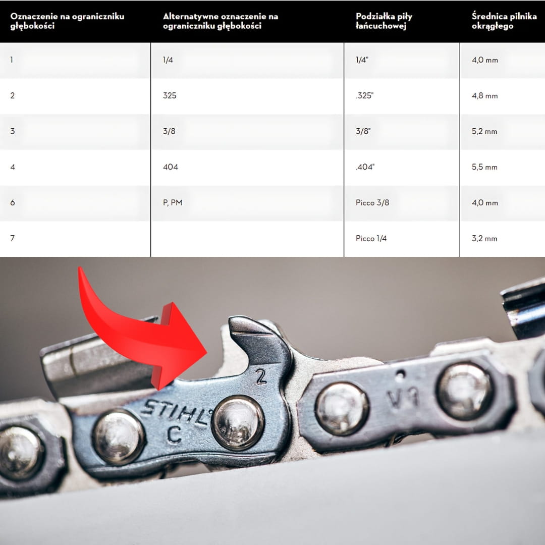 W przypadku wybierania łańcucha do pilarki STIHL ważne są podziałka piły łańcuchowej, szerokość rowka prowadnicy oraz długość prowadnicy i ilość ogniw. Najłatwiej takie informacje odczytać z tabliczki, wygrawerowanej na samej prowadnicy. W przypadku zatartej prowadnicy podziałkę łańcucha można również odczytać z naklejki na pilarce lub bezpośrednio z łańcucha - na ogranicznikach głębokości znajdują się oznaczenia. W przypadku cyfry 2 lub oznaczenia 325 mamy do czynienia z podziałką .325" (Tabela w galerii produktu).