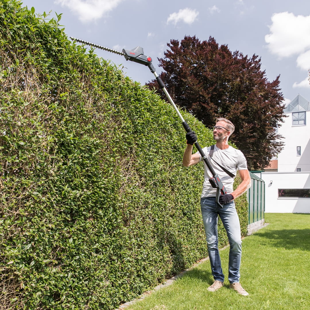 Nożyce akumulatorowe AL-KO HTA 1845: poręczne i dobrze wyważone nożyce do żywopłotu na wysięgniku, z regulowaną listwą tnącą