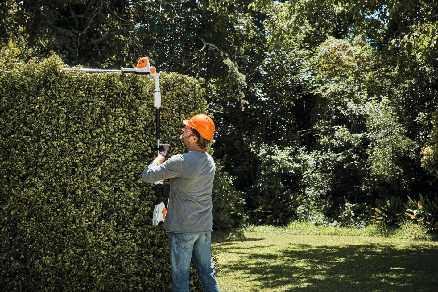 Kompaktowe nożyce akumulatorowe zainstalowane na wysięgniku. Uchwyt dzielony pozwala na beznarzędziowe rozmontowanie urządzenia, co ułatwia transport i przechowywanie. Stadnardowo dołączany jest również uchwyt naścienny, umożliwiający wieszanie elementów składowych urządzenia na ścianie. Listwa tnąca o krawędzi 47 cm z jednostronnie szlifowanymi zębami w kształcie kropli wody, pozwala na wydajne cięcie żywopłotu. Kąt nachylenia listwy tnącej można regulować beznarzędziowo, stopniowo w zakresie od -45° do +90°.