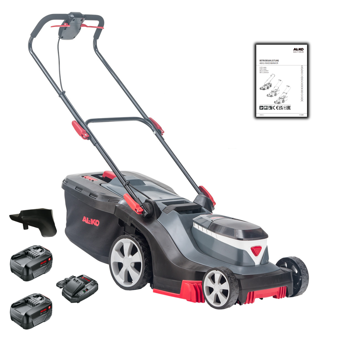 Kosiarka akumulatorowa AL-KO 38.2 Li Comfort: z funkcją mulczowania, o szerokości koszenia 38 cm, zestaw z 2x akumulatorami AL-KO B75 Li i ładowarką AL-KO C50 Li